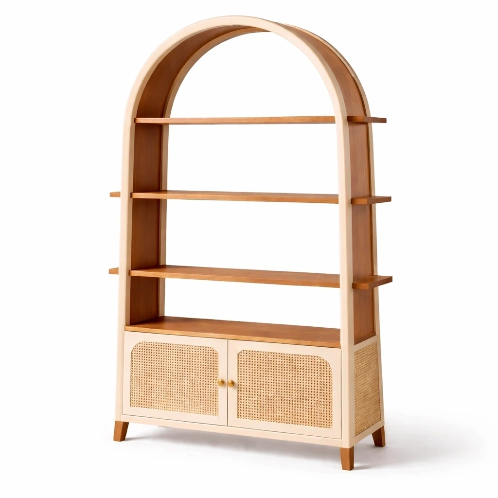 Description:This elegant arched bookshelf features open shelving and a double door cane cabinet for concealed storage.The solid wood frame provides reliable stability, while rattan panels add natural texture and warmth.Designed for displaying books, decorative items, and tableware.Suitable for contemporary living rooms, dining spaces, and home offices.