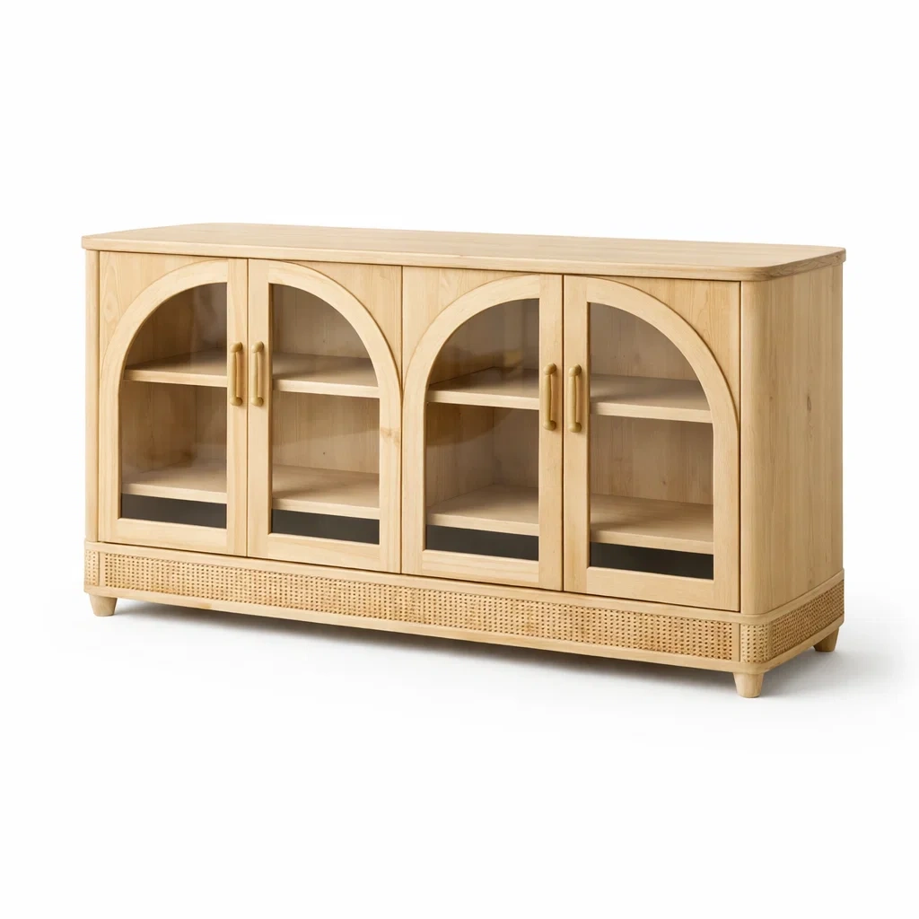 Description:This natural wood sideboard features arched tempered glass doors with a warm timber finish.
